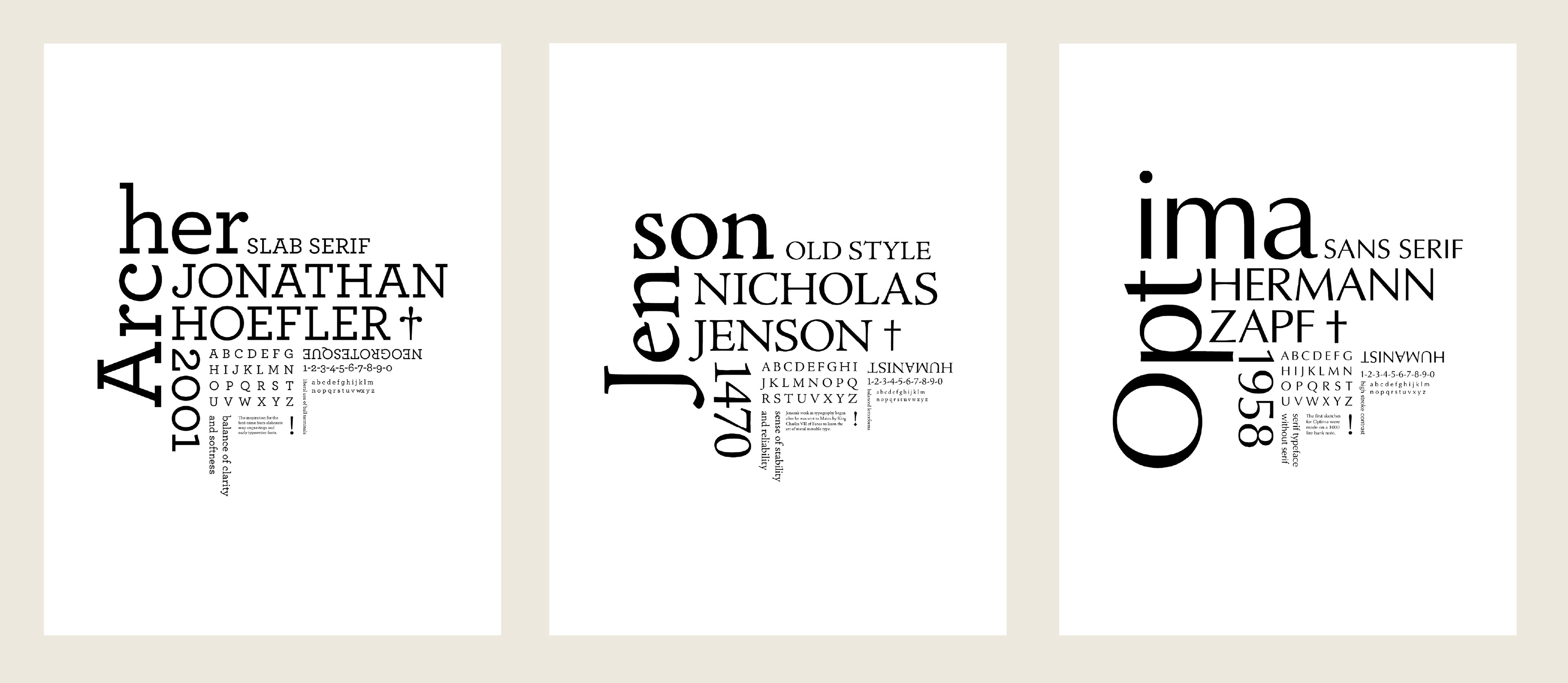 The design challenge was to make 3 type posters that all have different font classifications, but are all have consistent layouts. My solution involved using Optima, Jenson and Archer as my three fonts and bending them and the information in a diagonal upward arrow almost to signify the progress through fonts in history.